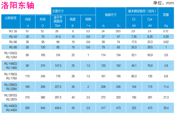 RU系列交叉滾子軸承型號尺寸規(guī)格表: